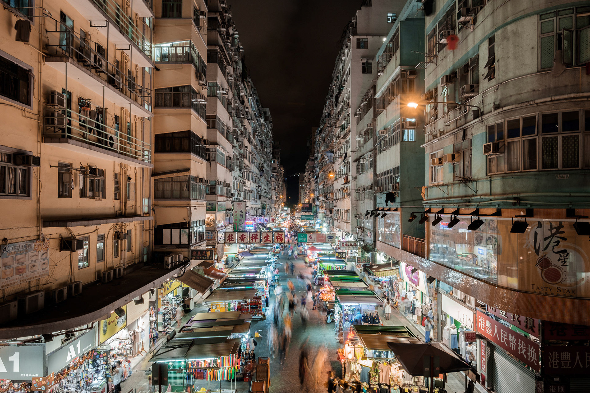 Mong Konk district in Hong Kong has some of the most dense streets in the world. people, advertising signs, buildings, shops and light live together in a hypnotic dance of shapes and colors.